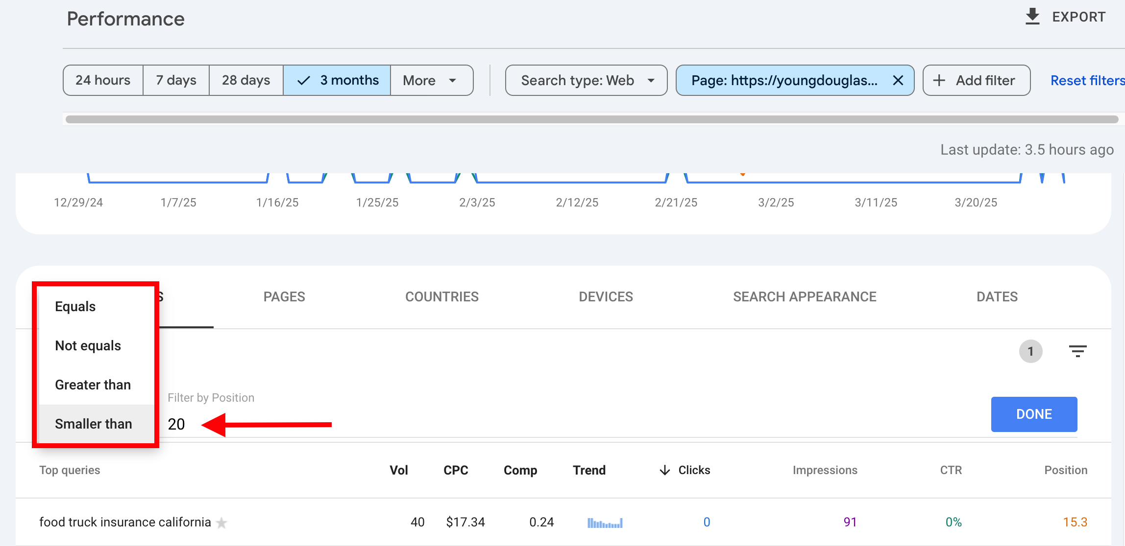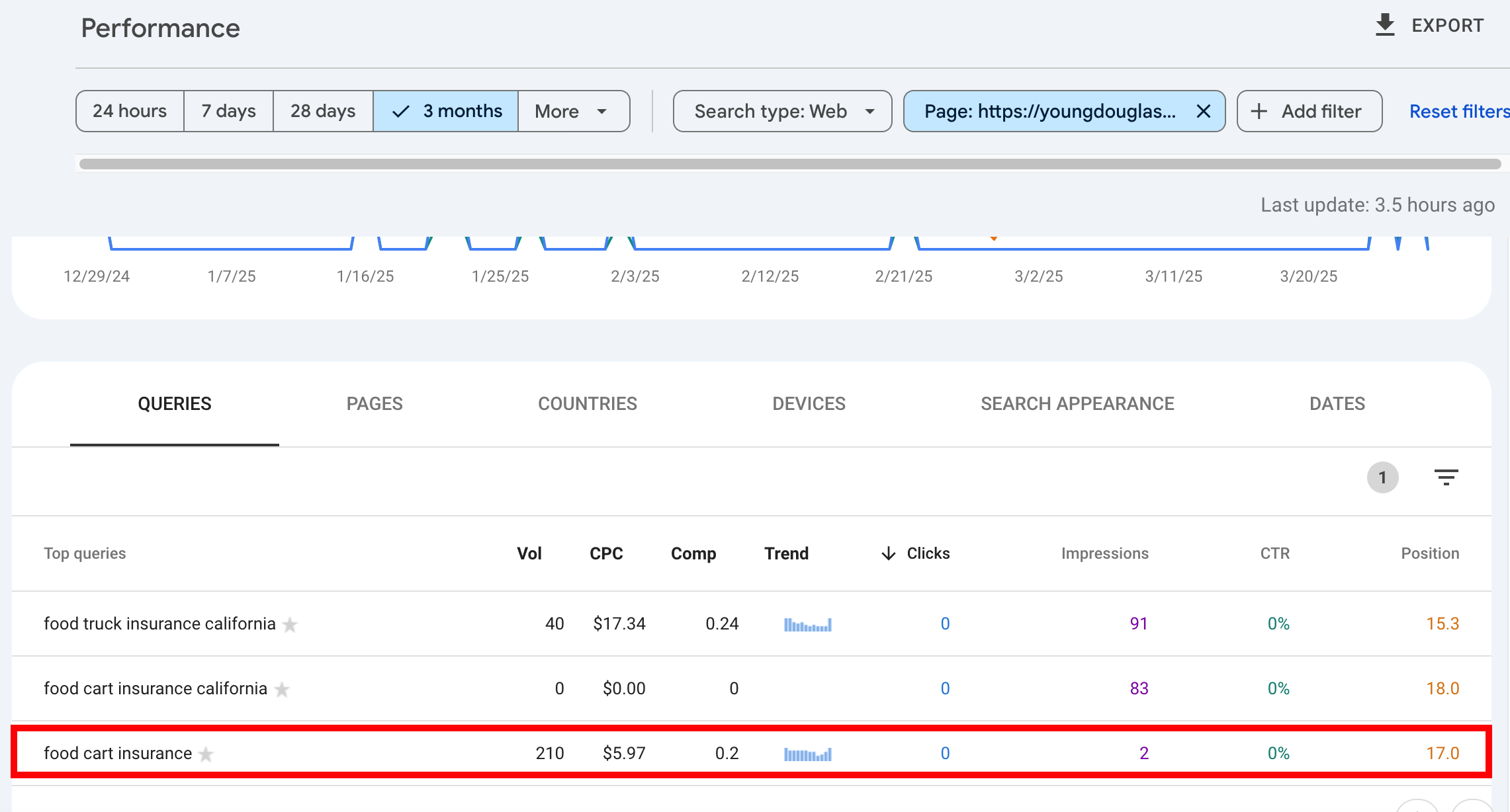 In this example, we found our California Food Truck Insurance page was ranking for more queries than just “food truck.”